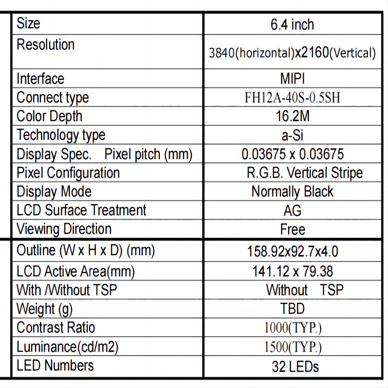 | Tamaño | 6,4" | Resolución | 3840*2160 |